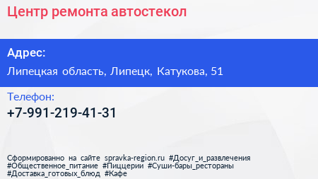 Центр ремонта автостекол по адресу Липецкая область, Липецк, Катукова, 51 в дальнейшем Организация, размещена в следующих категориях: