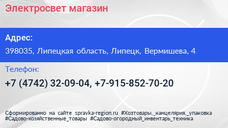 Электросвет, магазин по адресу 398035, Липецкая область, Липецк, Вермишева, 4 в дальнейшем Организация, размещена в следующих категориях: