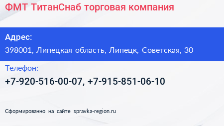 ФМТ ТитанСнаб, торговая компания по адресу 398001, Липецкая область, Липецк, Советская, 30 в дальнейшем Организация, размещена в следующих категориях: