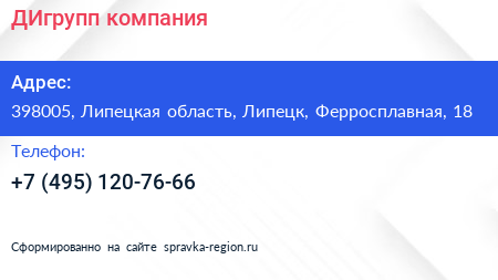 ДИгрупп, компания по адресу 398005, Липецкая область, Липецк, Ферросплавная, 18 в дальнейшем Организация, размещена в следующих категориях: