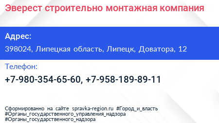 Эверест, строительно-монтажная компания по адресу 398024, Липецкая область, Липецк, Доватора, 12 в дальнейшем Организация, размещена в следующих категориях: