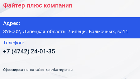 Файтер плюс, компания по адресу 398002, Липецкая область, Липецк, Балмочных, вл11 в дальнейшем Организация, размещена в следующих категориях: