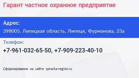 Гарант, частное охранное предприятие по адресу 398005, Липецкая область, Липецк, Фурманова, 23а в дальнейшем Организация, размещена в следующих категориях: