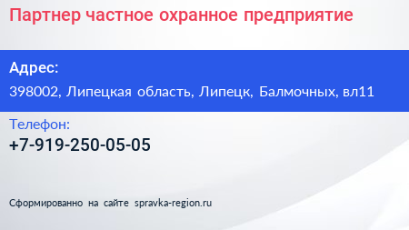 Партнер, частное охранное предприятие по адресу 398002, Липецкая область, Липецк, Балмочных, вл11 в дальнейшем Организация, размещена в следующих категориях: