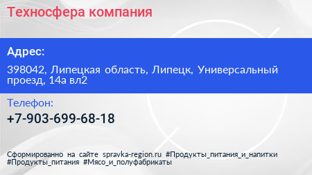 Техносфера, компания по адресу 398042, Липецкая область, Липецк, Универсальный проезд, 14а вл2 в дальнейшем Организация, размещена в следующих категориях: