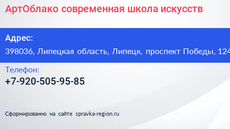 АртОблако, современная школа искусств по адресу 398036, Липецкая область, Липецк, проспект Победы, 124 в дальнейшем Организация, размещена в следующих категориях: