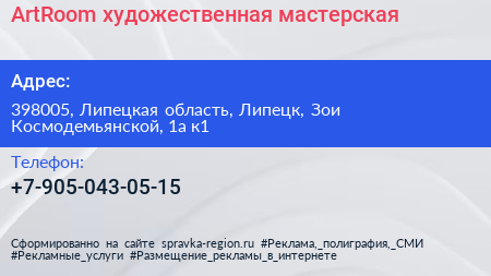 ArtRoom, художественная мастерская по адресу 398005, Липецкая область, Липецк, Зои Космодемьянской, 1а к1 в дальнейшем Организация, размещена в следующих категориях: