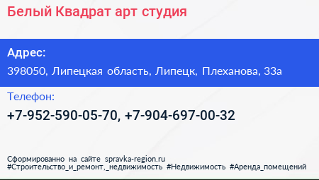 Белый Квадрат, арт-студия по адресу 398050, Липецкая область, Липецк, Плеханова, 33а в дальнейшем Организация, размещена в следующих категориях: