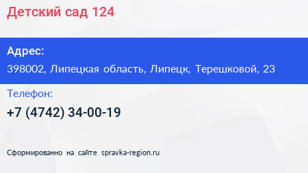 Детский сад №124 по адресу 398002, Липецкая область, Липецк, Терешковой, 23 в дальнейшем Организация, размещена в следующих категориях: