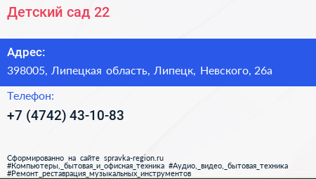 Детский сад №22 по адресу 398005, Липецкая область, Липецк, Невского, 26а в дальнейшем Организация, размещена в следующих категориях: