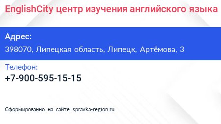 EnglishCity, центр изучения английского языка по адресу 398070, Липецкая область, Липецк, Артёмова, 3 в дальнейшем Организация, размещена в следующих категориях: