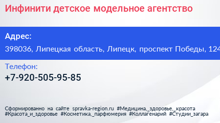 Инфинити, детское модельное агентство по адресу 398036, Липецкая область, Липецк, проспект Победы, 124 в дальнейшем Организация, размещена в следующих категориях: