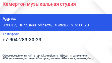 Камертон, музыкальная студия по адресу 398017, Липецкая область, Липецк, 9 Мая, 20 в дальнейшем Организация, размещена в следующих категориях:
