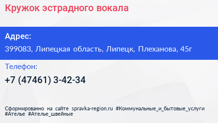 Кружок эстрадного вокала по адресу 399083, Липецкая область, Липецк, Плеханова, 45г в дальнейшем Организация, размещена в следующих категориях: