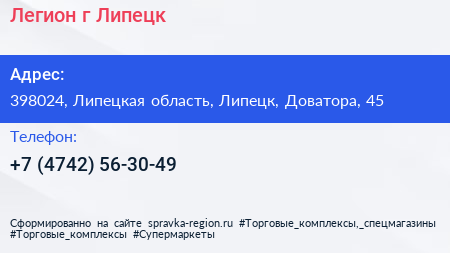 Легион, г. Липецк по адресу 398024, Липецкая область, Липецк, Доватора, 45 в дальнейшем Организация, размещена в следующих категориях: