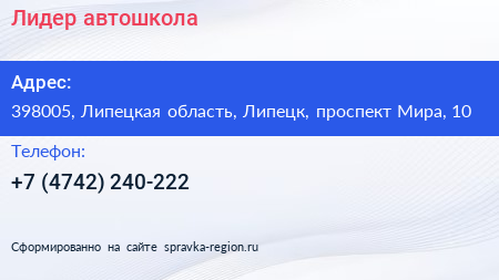 Лидер, автошкола по адресу 398005, Липецкая область, Липецк, проспект Мира, 10 в дальнейшем Организация, размещена в следующих категориях: