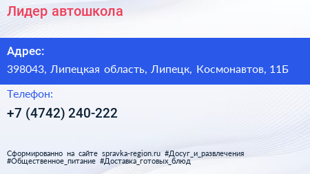 Лидер, автошкола по адресу 398043, Липецкая область, Липецк, Космонавтов, 11Б в дальнейшем Организация, размещена в следующих категориях: