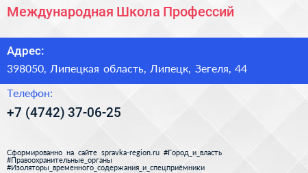 Международная Школа Профессий по адресу 398050, Липецкая область, Липецк, Зегеля, 44 в дальнейшем Организация, размещена в следующих категориях: