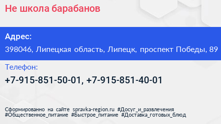Не школа барабанов по адресу 398046, Липецкая область, Липецк, проспект Победы, 89 в дальнейшем Организация, размещена в следующих категориях: