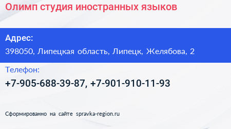 Олимп, студия иностранных языков по адресу 398050, Липецкая область, Липецк, Желябова, 2 в дальнейшем Организация, размещена в следующих категориях: