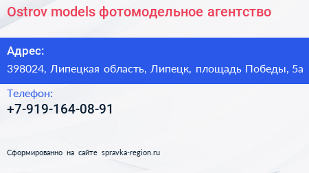 Ostrov models, фотомодельное агентство по адресу 398024, Липецкая область, Липецк, площадь Победы, 5а в дальнейшем Организация, размещена в следующих категориях: