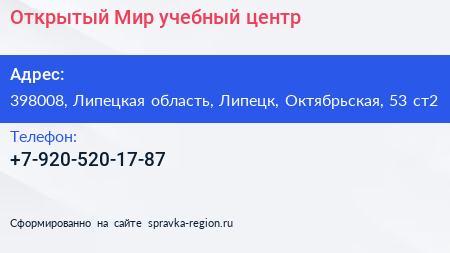 Открытый Мир, учебный центр по адресу 398008, Липецкая область, Липецк, Октябрьская, 53 ст2 в дальнейшем Организация, размещена в следующих категориях: