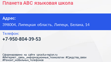 Планета ABC, языковая школа по адресу 398004, Липецкая область, Липецк, Белана, 14 в дальнейшем Организация, размещена в следующих категориях: