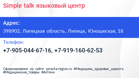 Simple talk, языковый центр по адресу 398902, Липецкая область, Липецк, Юношеская, 18 в дальнейшем Организация, размещена в следующих категориях: