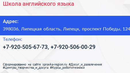 Школа английского языка по адресу 398036, Липецкая область, Липецк, проспект Победы, 124 в дальнейшем Организация, размещена в следующих категориях: