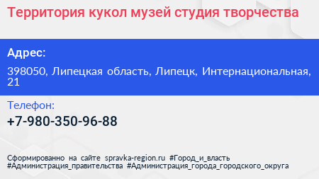Территория кукол, музей-студия творчества по адресу 398050, Липецкая область, Липецк, Интернациональная, 21 в дальнейшем Организация, размещена в следующих категориях: