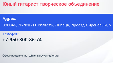 Юный гитарист, творческое объединение по адресу 398046, Липецкая область, Липецк, проезд Сиреневый, 9 в дальнейшем Организация, размещена в следующих категориях: