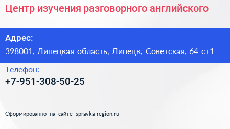 Центр изучения разговорного английского по адресу 398001, Липецкая область, Липецк, Советская, 64 ст1 в дальнейшем Организация, размещена в следующих категориях: