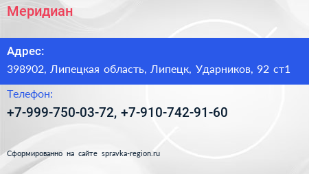 Меридиан по адресу 398902, Липецкая область, Липецк, Ударников, 92 ст1 в дальнейшем Организация, размещена в следующих категориях: