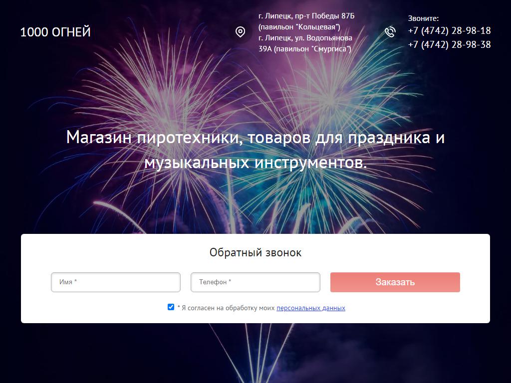 1000 Огней, магазин фейерверков по адресу 398046, Липецкая область, Липецк, Водопьянова, 39а в дальнейшем Организация, размещена в следующих категориях: