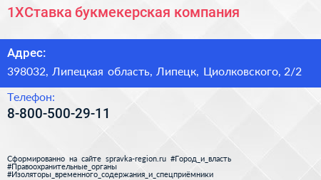 1XСтавка, букмекерская компания по адресу 398032, Липецкая область, Липецк, Циолковского, 2/2 в дальнейшем Организация, размещена в следующих категориях: