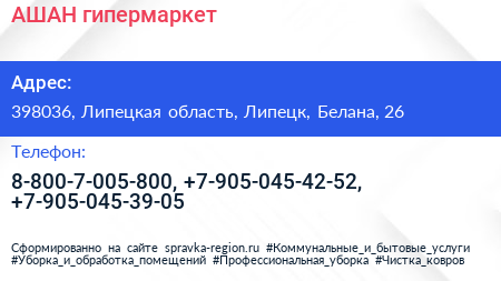 АШАН, гипермаркет по адресу 398036, Липецкая область, Липецк, Белана, 26 в дальнейшем Организация, размещена в следующих категориях: