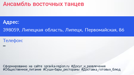 Ансамбль восточных танцев по адресу 398059, Липецкая область, Липецк, Первомайская, 86 в дальнейшем Организация, размещена в следующих категориях: