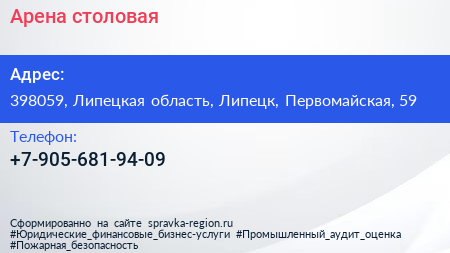Арена, столовая по адресу 398059, Липецкая область, Липецк, Первомайская, 59 в дальнейшем Организация, размещена в следующих категориях: