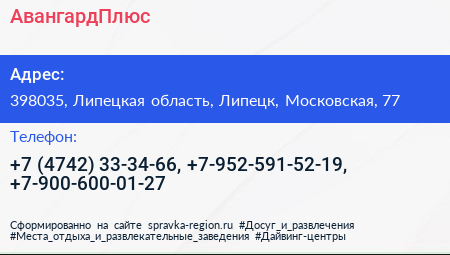 АвангардПлюс по адресу 398035, Липецкая область, Липецк, Московская, 77 в дальнейшем Организация, размещена в следующих категориях: