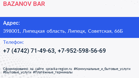 BAZANOV-BAR по адресу 398001, Липецкая область, Липецк, Советская, 66Б в дальнейшем Организация, размещена в следующих категориях: