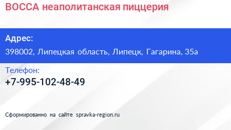 BOCCA, неаполитанская пиццерия по адресу 398002, Липецкая область, Липецк, Гагарина, 35а в дальнейшем Организация, размещена в следующих категориях: