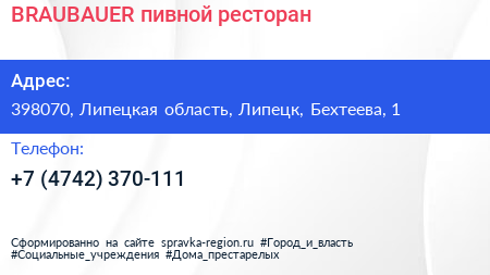 BRAUBAUER, пивной ресторан по адресу 398070, Липецкая область, Липецк, Бехтеева, 1 в дальнейшем Организация, размещена в следующих категориях: