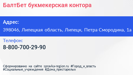 БалтБет, букмекерская контора по адресу 398046, Липецкая область, Липецк, Петра Смородина, 1а в дальнейшем Организация, размещена в следующих категориях: