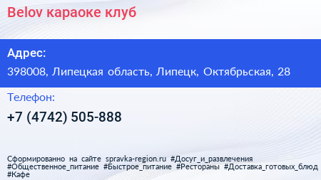 Belov, караоке-клуб по адресу 398008, Липецкая область, Липецк, Октябрьская, 28 в дальнейшем Организация, размещена в следующих категориях: