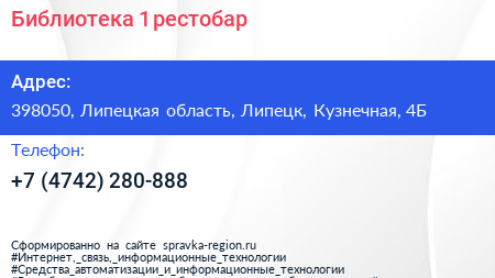 Библиотека №1, рестобар по адресу 398050, Липецкая область, Липецк, Кузнечная, 4Б в дальнейшем Организация, размещена в следующих категориях: