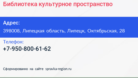 Библиотека, культурное пространство по адресу 398008, Липецкая область, Липецк, Октябрьская, 28 в дальнейшем Организация, размещена в следующих категориях: