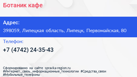 Ботаник, кафе по адресу 398059, Липецкая область, Липецк, Первомайская, 80 в дальнейшем Организация, размещена в следующих категориях: