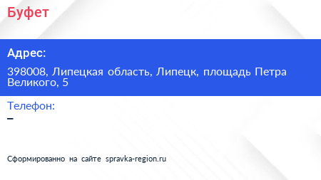 Буфет по адресу 398008, Липецкая область, Липецк, площадь Петра Великого, 5 в дальнейшем Организация, размещена в следующих категориях: