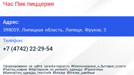 Час-Пик, пиццерия по адресу 398059, Липецкая область, Липецк, Фрунзе, 5 в дальнейшем Организация, размещена в следующих категориях: