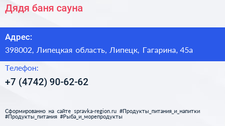 Дядя баня, сауна по адресу 398002, Липецкая область, Липецк, Гагарина, 45а в дальнейшем Организация, размещена в следующих категориях: